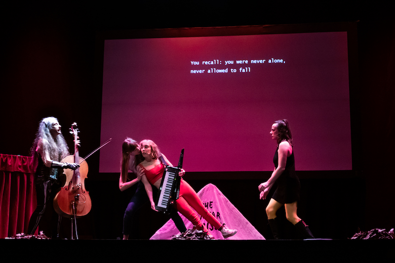 Created in 2019, The Near Misses is an experimental electro-pop opera in the form of an all-female band also called “The Near Misses.” This highly collaborative multimedia show contains an original song cycle, sound collages, choreography, and video projections centered around true near-death stories. We’ve curated these diverse survival stories to represent a range of scenarios and power dynamics from the personal to the global.